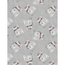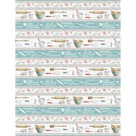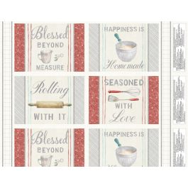 The table topper quilt for “Homemade Happiness” features the placemat panels bordered by one of the small repeating stripes.