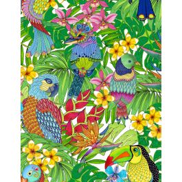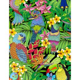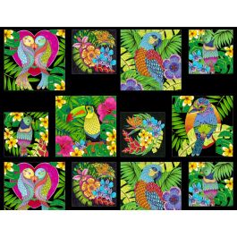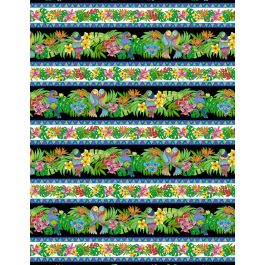The “Tropical Flair” project is all about color in a full-sized quilt that uses some of the panel squares & the repeating stripe.
